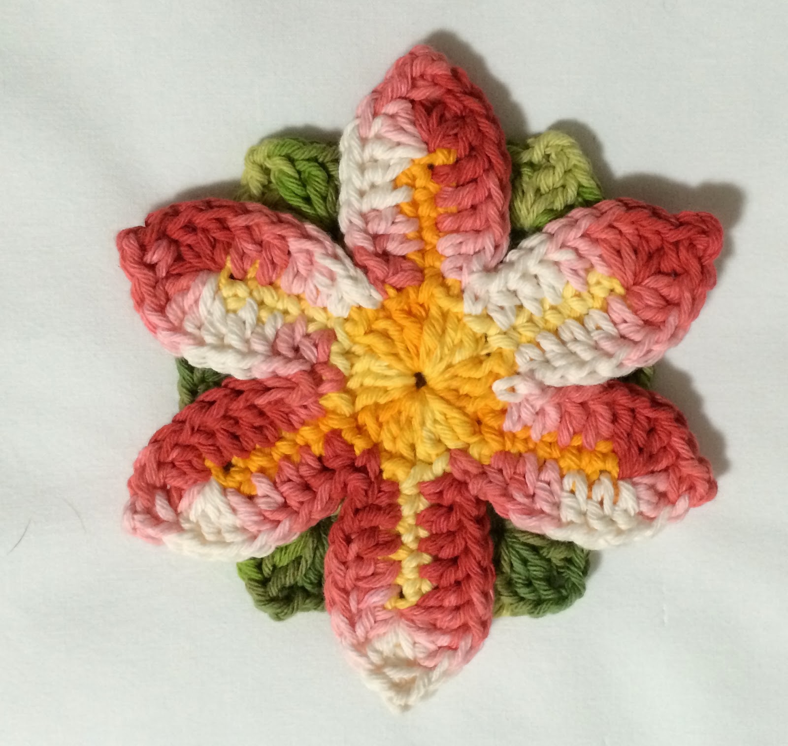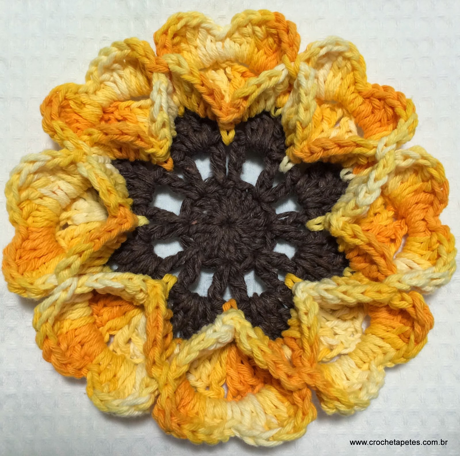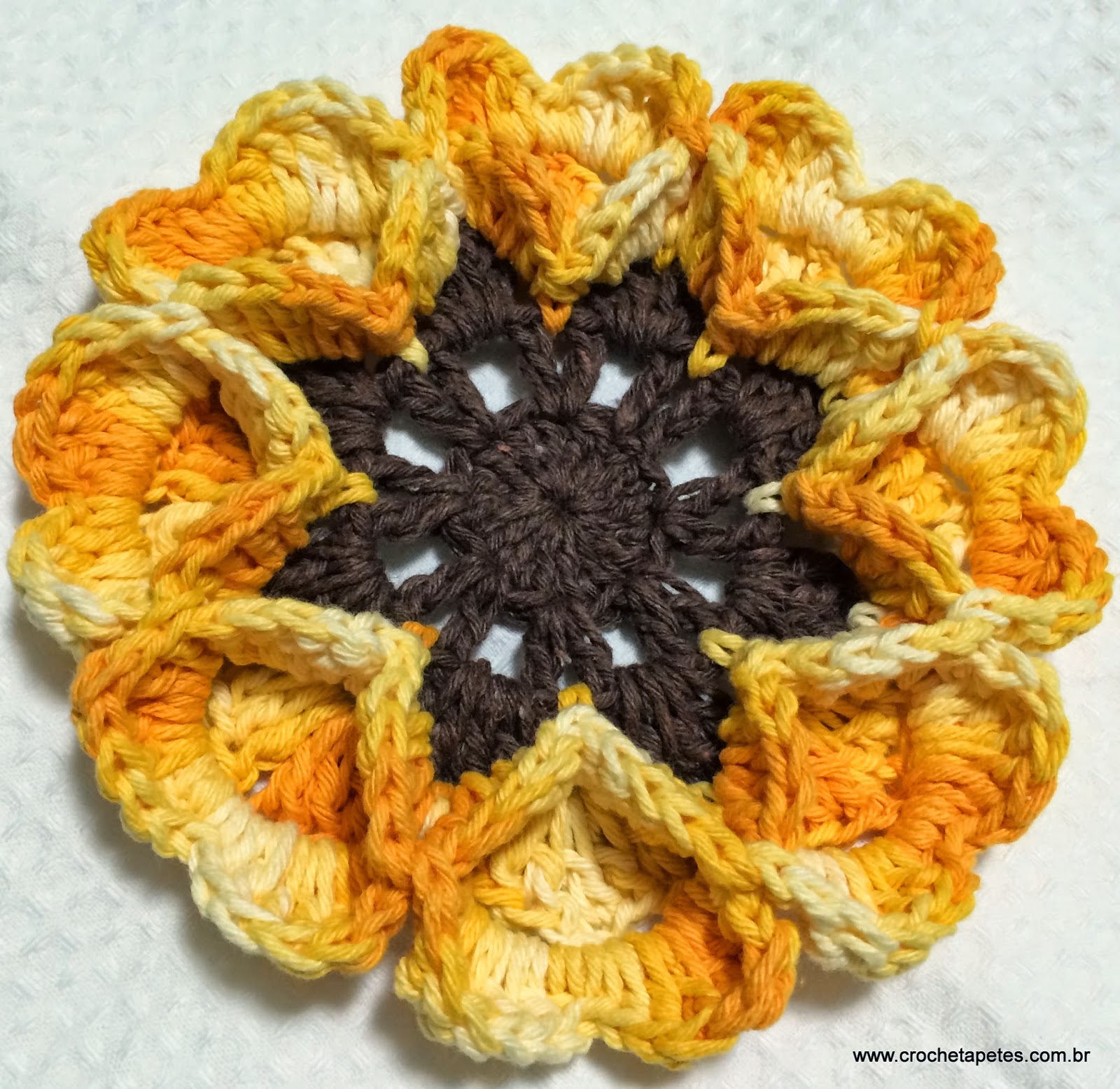 12 - Suba com 3 correntes, e vamos voltar a trabalhar pelo lado direito da flor, estas 3 correntes será a alça atrás da pétala. Então enrole a linha na agulha para fazer ponto alto e vire a flor pro lado direito novamente.