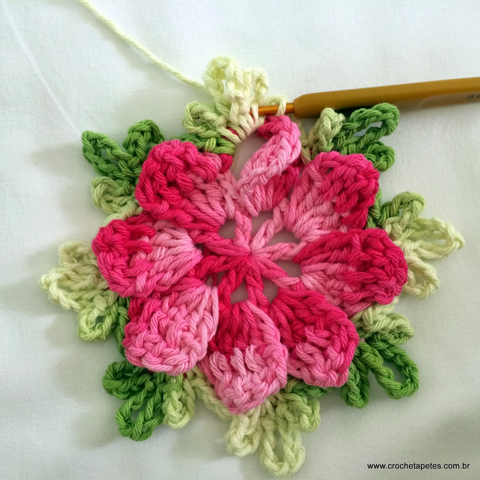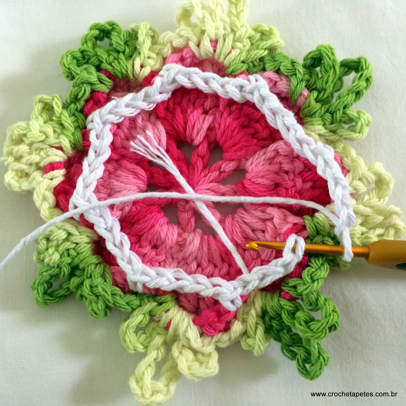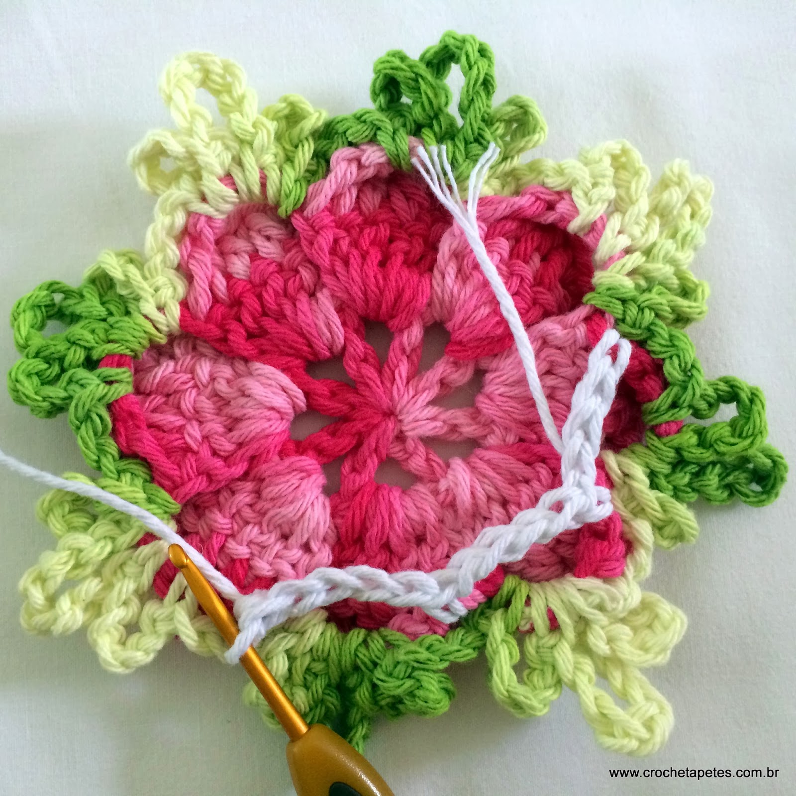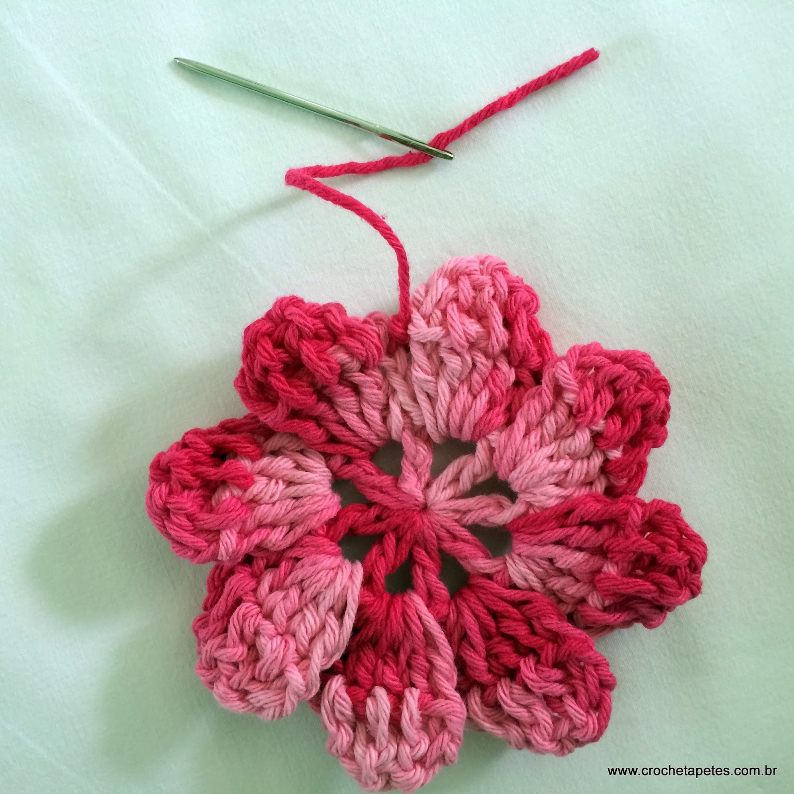 18 - Pelo lado direito da flor faça 5 correntes