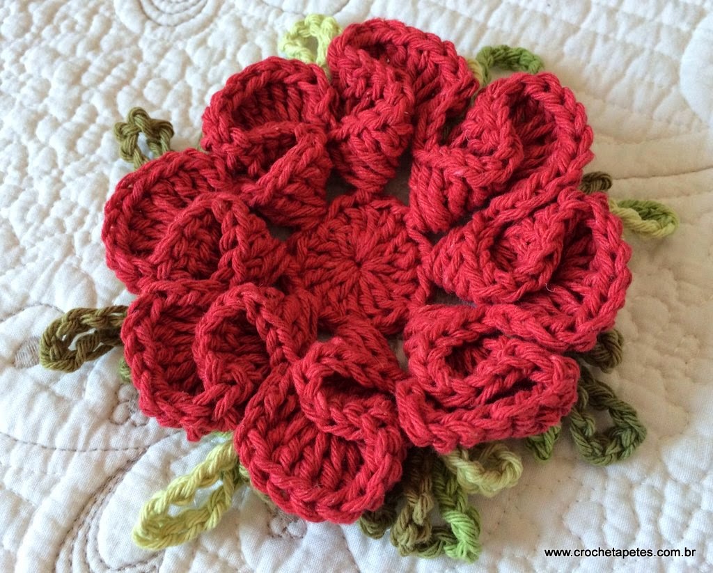 26 - na pétala seguinte, prenda com um ponto baixo e siga fazendo as alças com 4 correntes de intervalo.