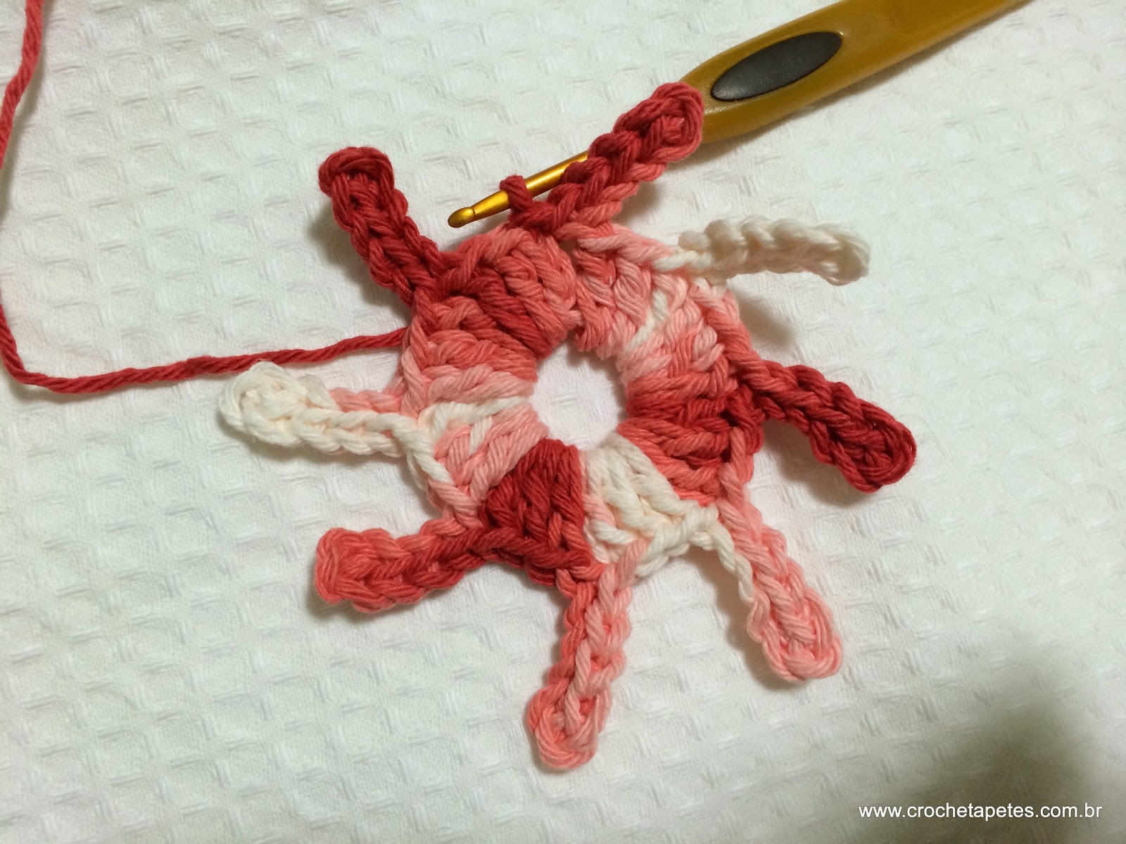 07 - Prenda na 3ª correntinha com um ponto baixíssimo. Note que temos 8 intervalos de duas correntes, portanto vamos trabalhar as pétalas nestes intervalos, no final teremos 8 pétalas.