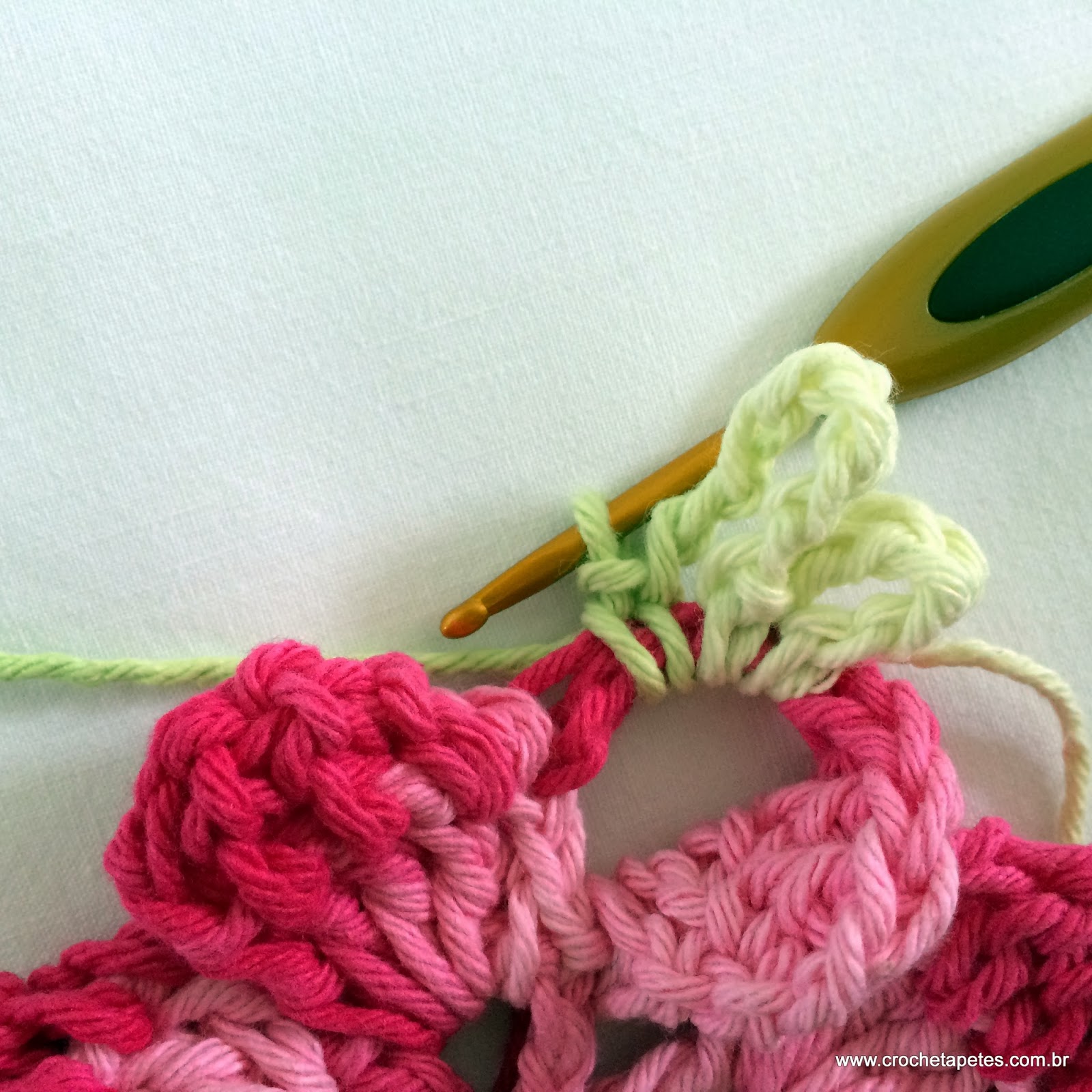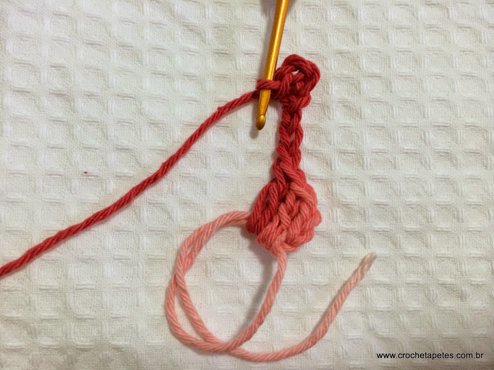 05 - Faça mais 3 pontos baixíssimos voltando na correntinha e chegaremos até a base