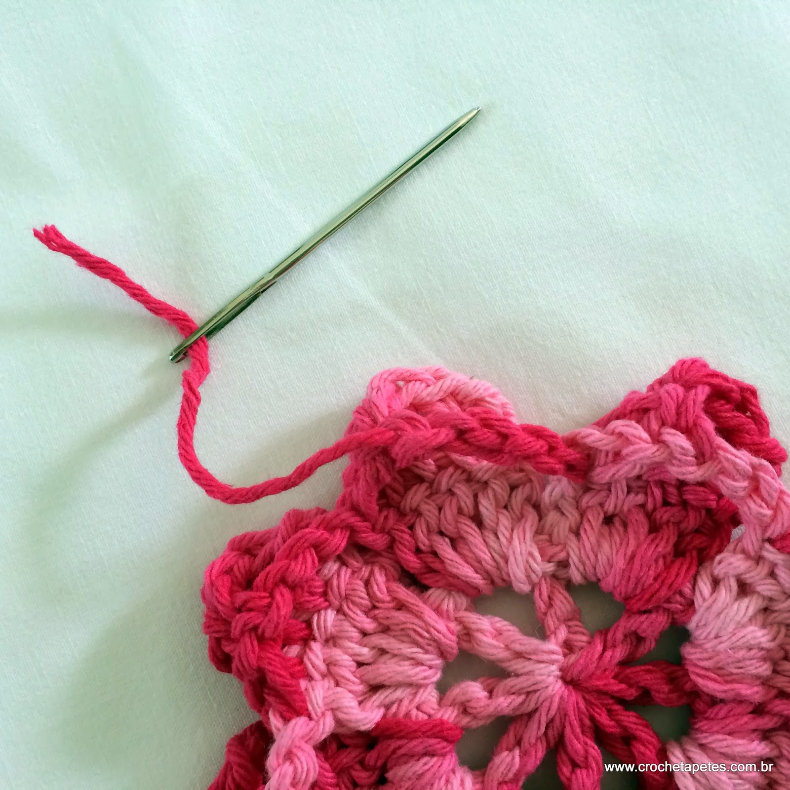 16 - Puxe a linha, corte e arremate costurando por trás voltando na correntinha como pode ver nas imagens.