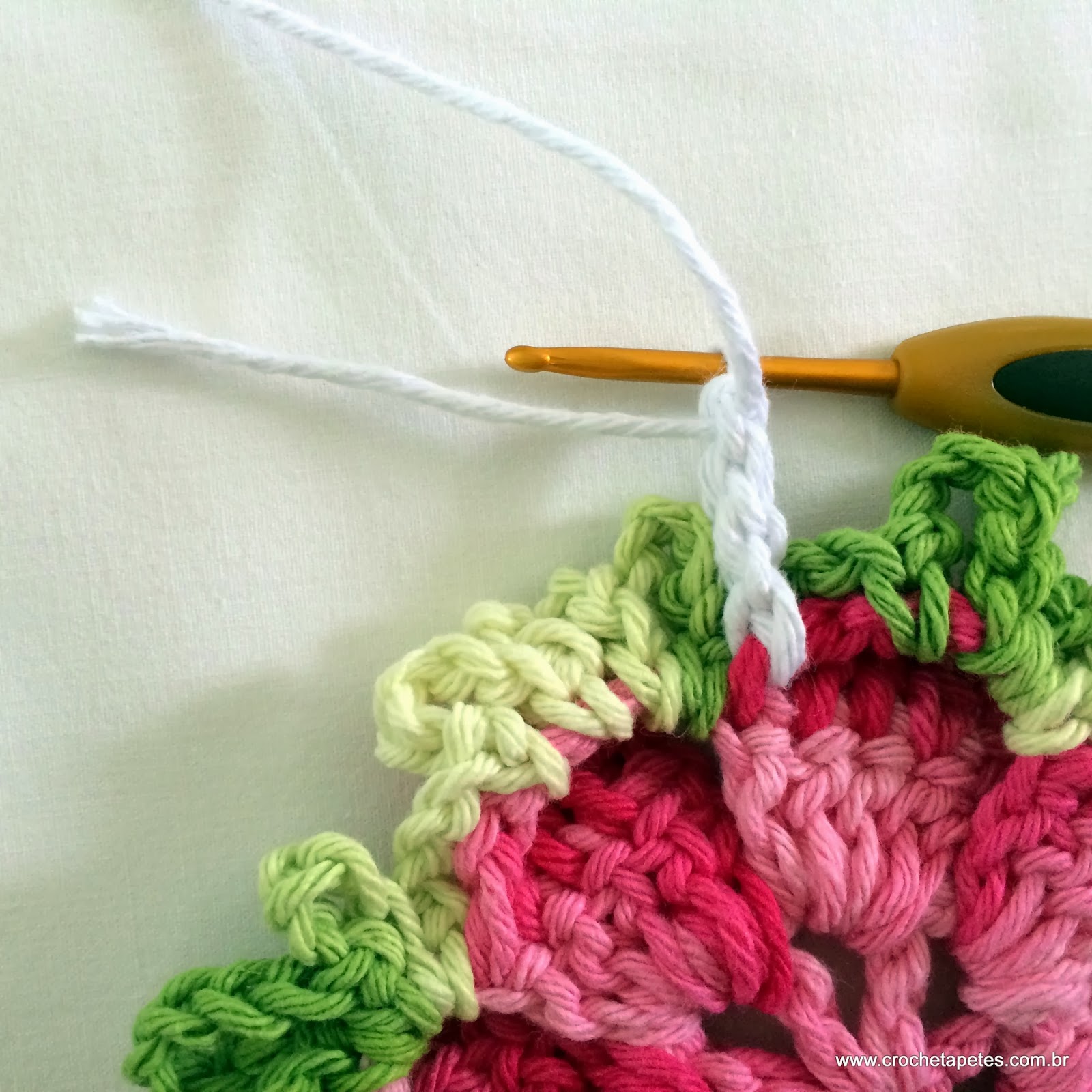 10- Suba com duas correntes e agora preste bem atenção, estamos trabalhando pelo lado direito da flor.