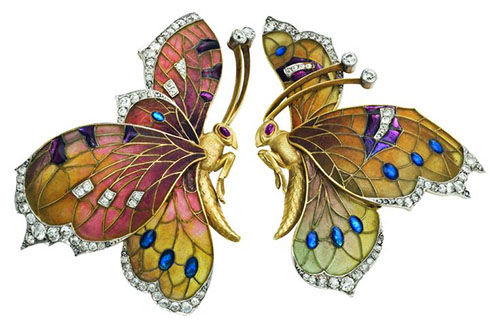 Кулон, именуемый в музейных и художественных каталогах «Мотылёк» (в единственном числе), представляет собой двух бабочек с раскрытыми соприкасающимися крыльями и перекрещивающимися усиками.