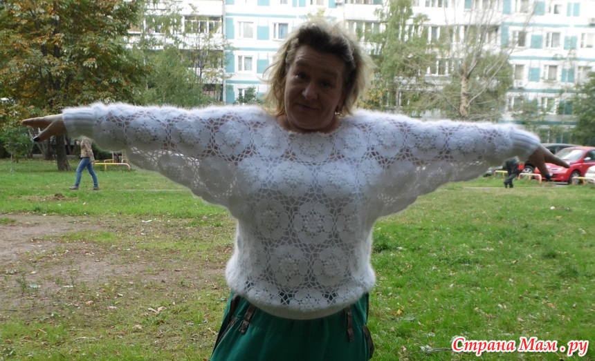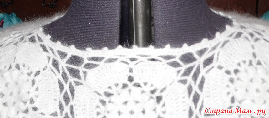 Ну а тем кто хочет пошире горловину, вяжем пока два раза по 4 мотива как на фото синей кофты.