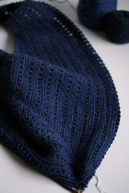 Полосатая текстура платка достигается за счет чередующихся полос платочной вязки и рядов с накидами. Пряжа: Для вязания платка могут использоваться различные по весу и метражу виды пряжи. Образец синего цвета связан из пряжи Malabrigo Yarn Lace (цвета Paris Night и Indigo) в две нити. 50 г по 1 мотку каждого цвета.