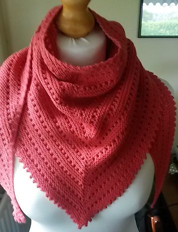 Завершение работы: закройте петли в следующем лиц.р. следующим образом: * 2 п. вместе лиц. за заднюю стенку, перенести образовавшуюся петлю назад на левую спицу * повторять до конца ряда. Блокируйте платок до необходимых размеров.