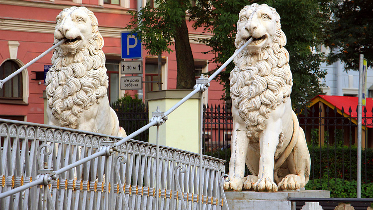 Львиный мост через канал Грибоедова находится неподалеку от Банковского. Они были открыты в один год, а скульптуры львов выполнены тем же мастером – П. Соколовым. Львы, как и грифоны, выполняют две функции: эстетическую и инженерную, недаром они пастями удерживают цепи. Хотя мост и небольшой, он произвёл на немцев такое впечатление, что в 1838 году в Берлине на территории Тиргартена была установлена его уменьшенная деревянная копия.