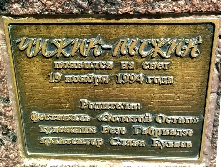 Появился Чижик-Пыжик напротив здания бывшего училища правоведения, что на Фонтанке, в 1994 году, во время работы фестиваля юмора "Золотой Остап". В прошлом, будущие правоведы, получавшие образование в этом училище, носили желто-зеленые мундиры, отчего в народе их насмешливо прозвали "чижиками-пыжиками".