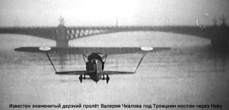 Валерий Чкалов, легендарный советский лётчик, на спор пролетел под пролётом Троицкого моста. Романтичная версия этого события показана в фильме «Валерий Чкалов» (1941). Пролёт под мостом для съёмок исполнил лётчик Евгений Борисенко, с той разницей, что Чкалову за такой пилотаж был объявлен выговор.