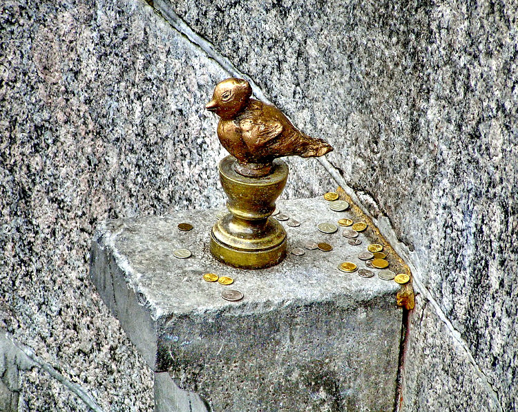 Маленькая скульптурка, высотой всего 11 сантиметров, и весом около пяти килограмм, стала своеобразным талисманом Петербурга...несмотря на всенародную любовь, бронзовая птичка уже ни одиножды становилась добычей воров. Тем не менее, питерской милиции каждый раз удавалось разыскать похищенную скульптурку и возвратить, к радости петербуржцев, на свое законное место.