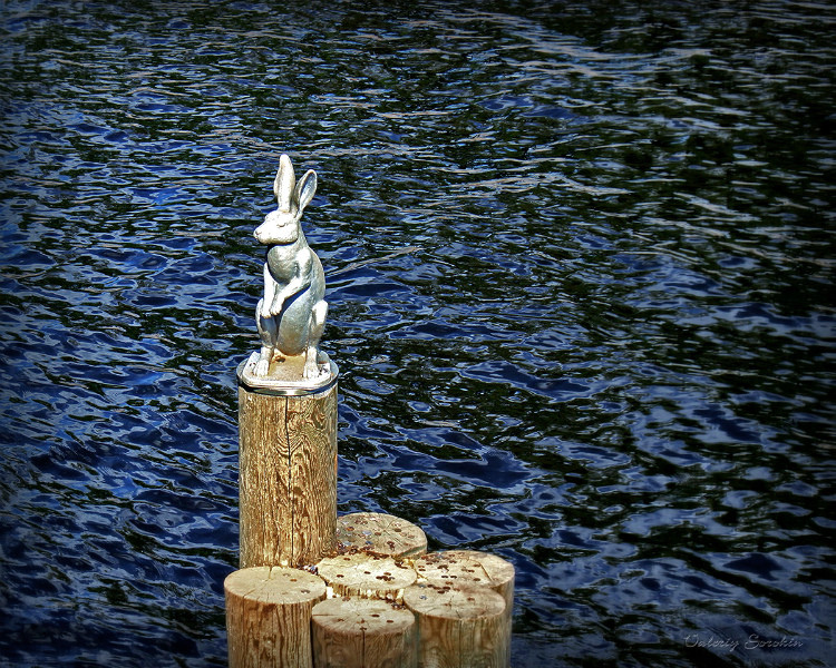 Скульптура «Зайчик, спасшийся от наводнения». Скульптор В.А.Петровичев, архитектор С.Я.Петченко. Материал: сплав силумина, алюминия и дюраля. Высота: 58 см.