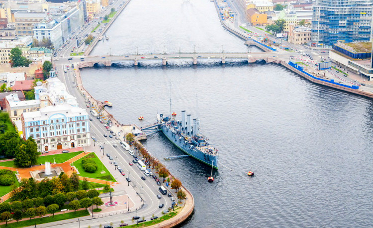 В 1917 году, стоявший за Николаевским мостом у Английской набережной, крейсер Аврора произвёл знаменитый исторический залп в сторону Зимнего Дворца.