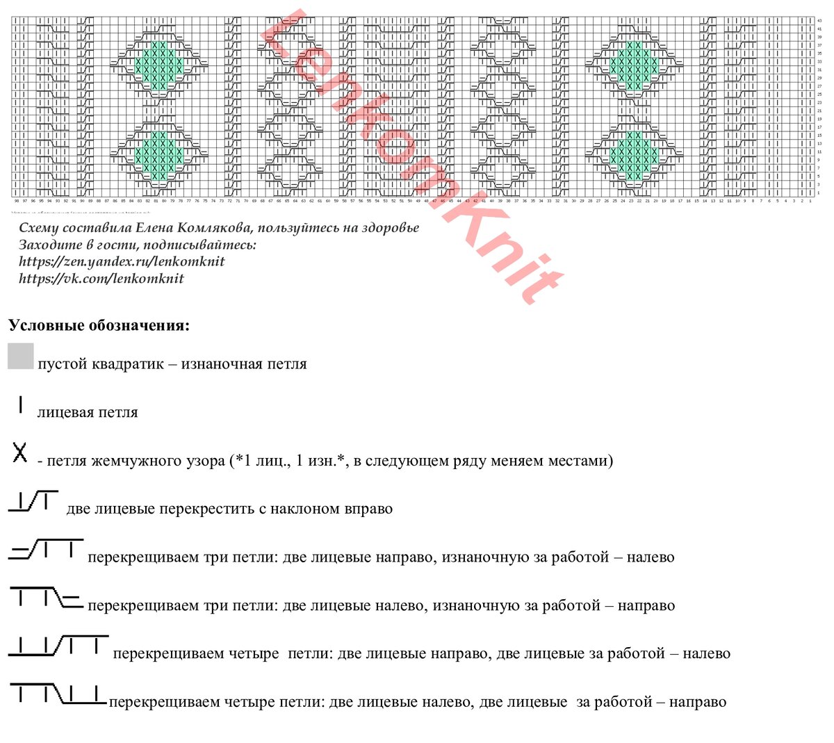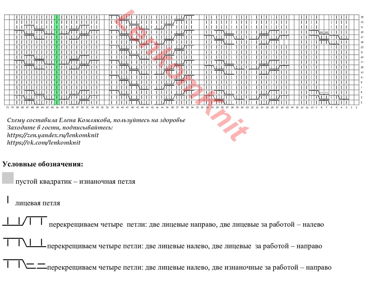 Это - схема узоров для этой модели. Зелены отмечена центральная петля. На сайте, где можно рисовать схемы, ширина раппорта ограничена 99 петлями. Поэтому я нарисовала только правую часть, а слева вяжется точно так же, зеркально.