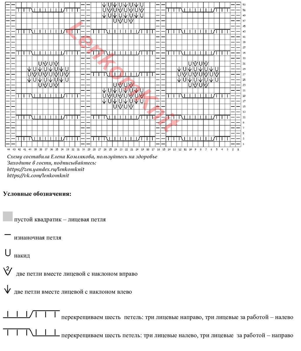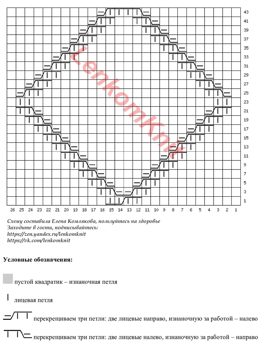 Схема узора простая, но я ее нарисовала на всякий случай. На схеме - раппорт узора в ширину (26 петель) и в высоту (44 ряда).