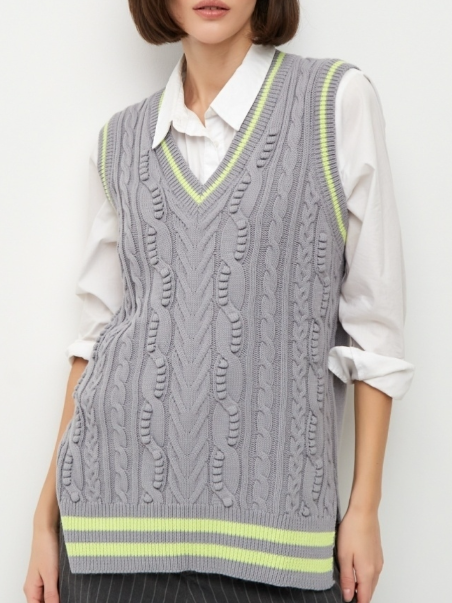 Первая безрукавка связана интересными косами, ее освежают желтые полоски. Они же придают актуальный и динамичный вид. Без этих полосок модель не выглядела бы так выигрышно.