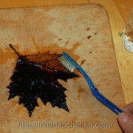 Можно взять и высушенные под прессом листья. В таком случае у вас получится не скелетированный листик, а просто ажурный – тоже интересный вариант. И тут как раз щетка может быть не очень жесткой.