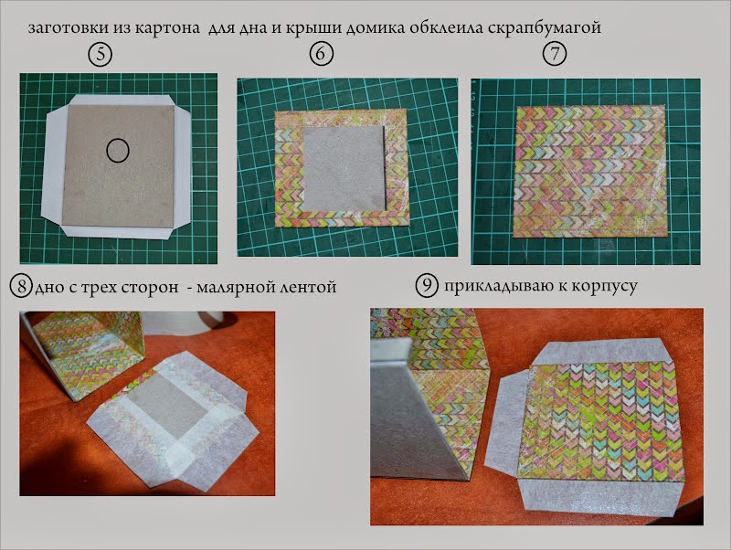 крепила на малярный скотч , под углом к корпусу, чтобы потом она не топорщилась, между крышей и корпусом - зазор. С внутренней стороны домика - тоже скотч, потом он спрячется наклеенной сверху нарядной бумагой