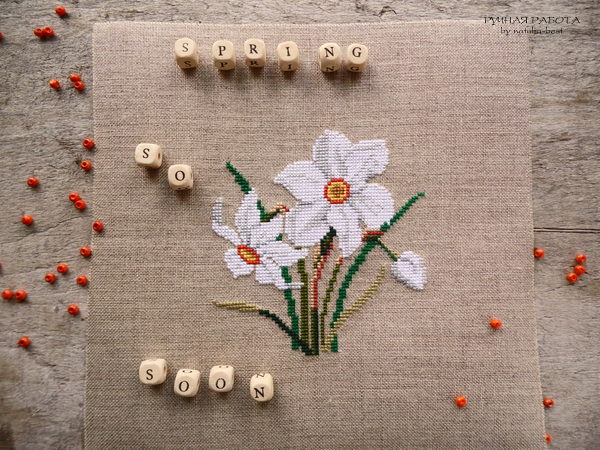 Весна в душе и в вышивке. Ещё один дизайн от Герда Бенгтссон. Давно мне нравился этот нарцисс. Он как напоминание о моём далёком деревенском детстве, когда я утром пробиралась по высокой, усыпанной росой, траве палисадника, чтобы отыскать в ней нежно пахнущие белоснежные цветы...