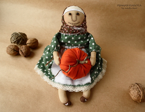 А теперь… куклы! Мне кажется, что я не шила кукол очень давно, поэтому за этих бралась с большим удовольствием. Мои любимые персонажи – бабульки. Первая получилась осенней, по-другому и быть не могло, потому что подобранные для неё ткани – осень в чистом виде.