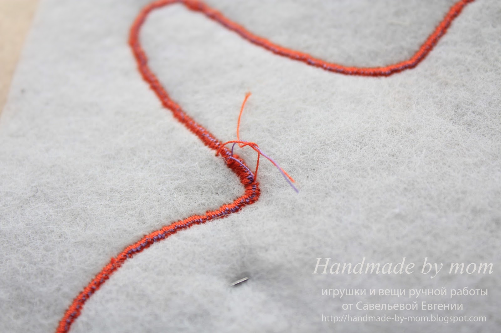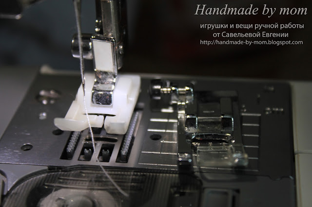 Пришиваем снова тефлоновой лапкой, шаг стежка тут 2.5 мм. Оставляем отверстие. Прямо тут же, подняв лапку, но оставив иголку в ткани, добавляем пуговички во внутрь.