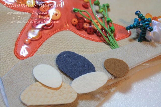 Ну и небольшие дополнения к страничке, завязываем бусины на вощеный шнур, пришиваем песок, и добавляем камешки по желанию)