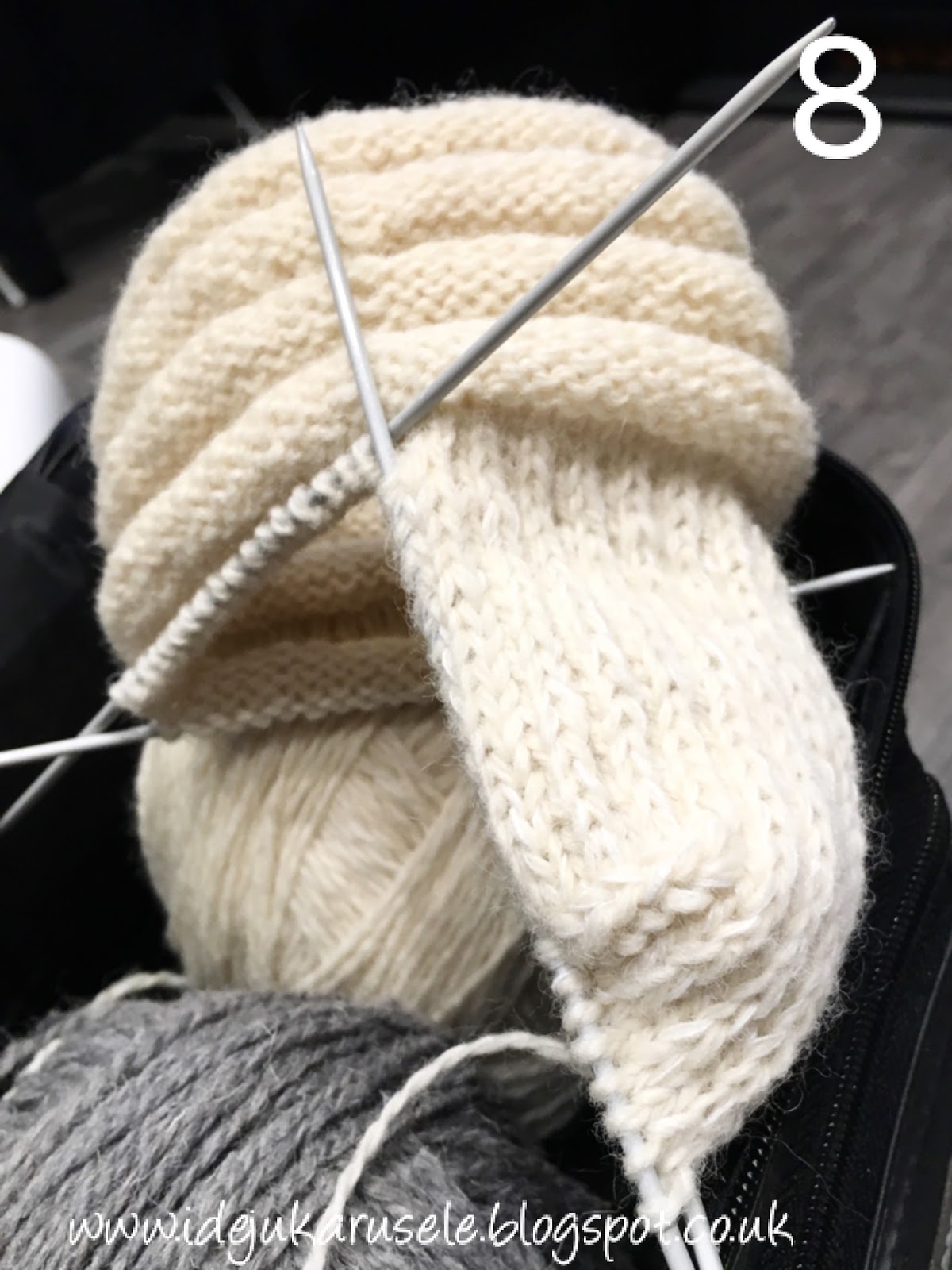 Dabar prasideda kulno užrietimas. Formulė Nr.2: ant virbalo turi likti tiek akių-kiek buvo ant vieno virbalo pradedant riešą. Ir visiškai nesvarbu, kokio dydžio kojines mezgu, visad naudoju šią formulę. Šiuo atveju man turi likti 15 akių. Tam likusias akis po vieną sumezgu kiekvienos eilutės pabaigoje, tol kol šoninių nebelieka. Gaunasi tarsi "kapišonas".