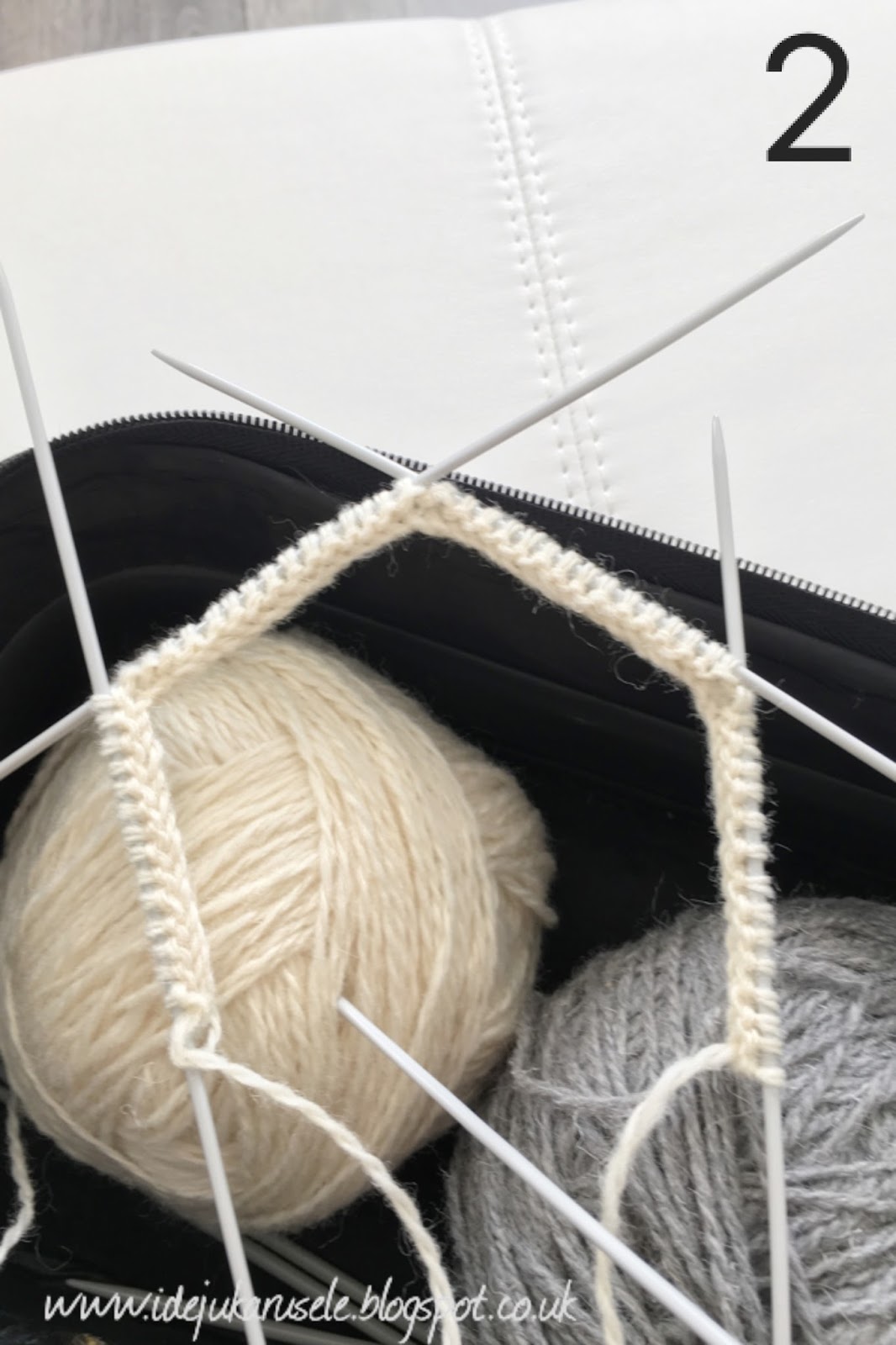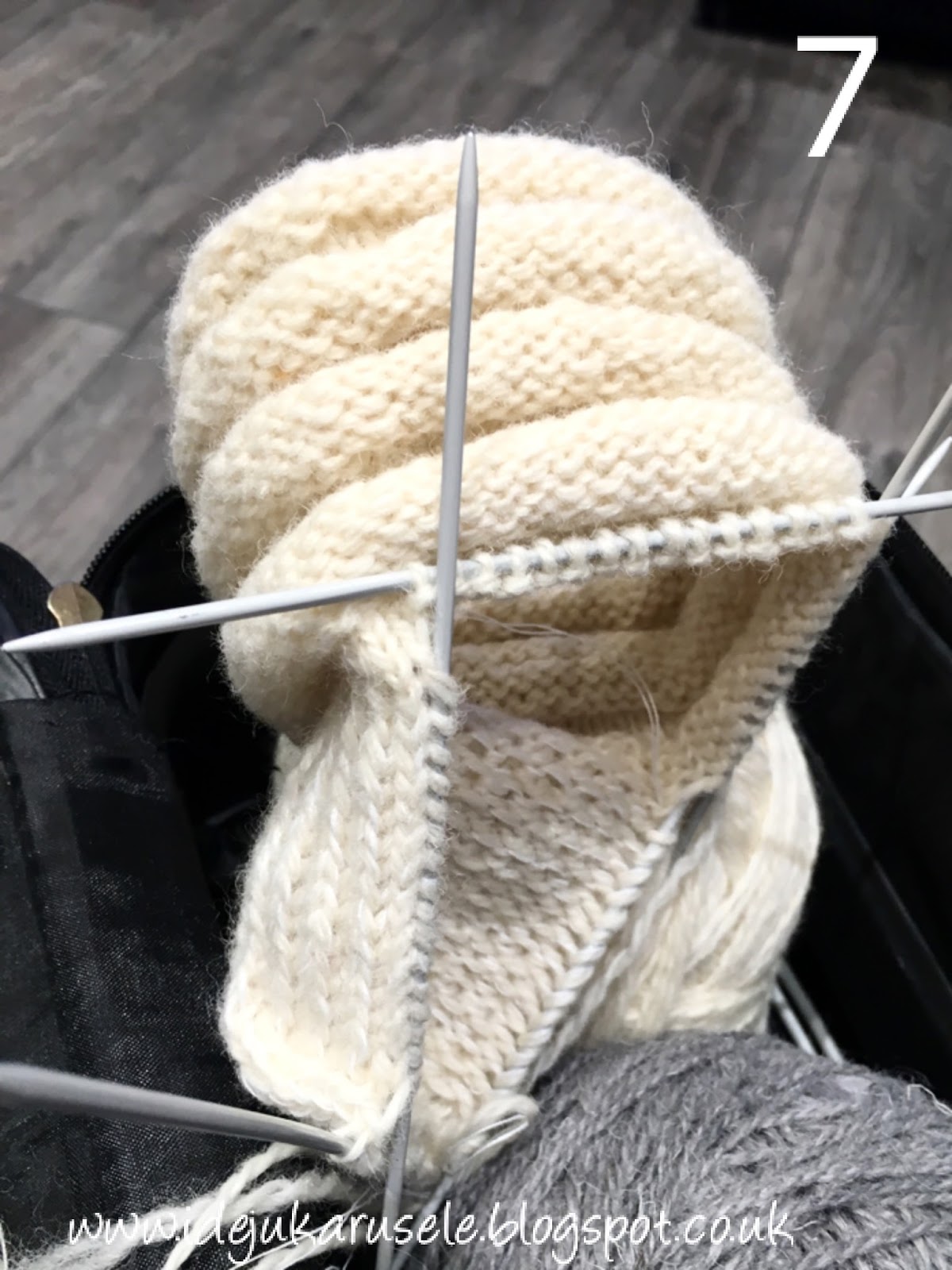 Formulė Nr.3: sumegzgu po dvi akis kas antrą eilutę iš abiejų kulno šonų, kol lieka tiek pat akių, kiek pradedant riešą. Šiuo atveju mezgu ratu 5 virbalais ir lieka po 15 akių ant kiekvieno virbalo. Paįvairinimui į priekinę dalį įterpiu ir raštelį: