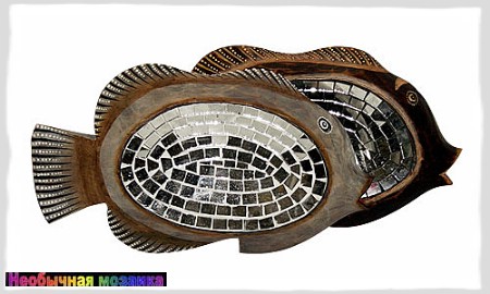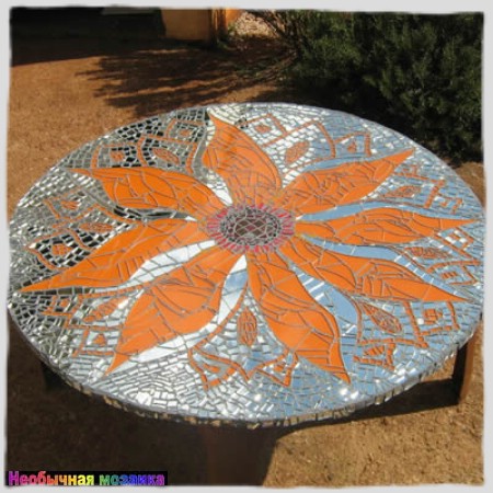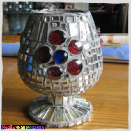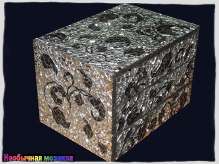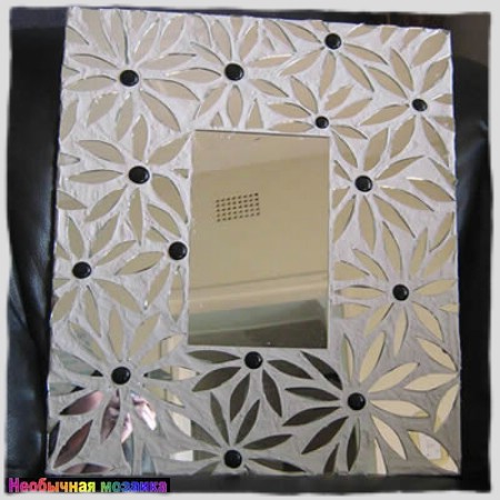 Сделать такую мозаику совсем не сложно. Нужно приклеить кусочки зеркал универсальным клеем на выбранную Вами основу и затереть затиркой. Узор можно составить любой-абстрактный или геометрический, можно выложить цветы.