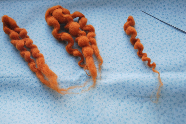 Далее берем нашу голову уже с шиньоном из шерсти и начинаем приваливать каждую прядку за прядкой. Я использую для этого одну иголку. Видите как получается практически ничего не видно.