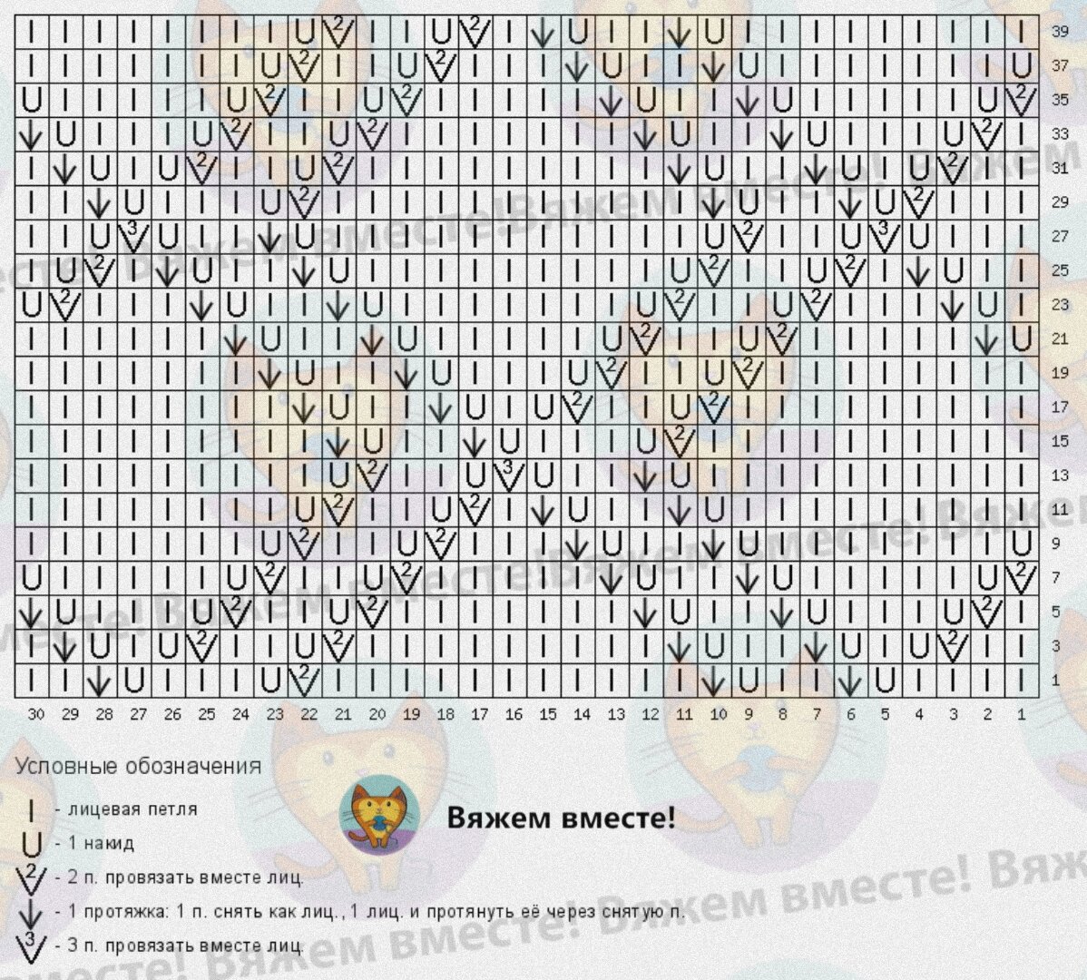 На схеме даны только лицевые ряды, чётные следует вязать по рисунку.