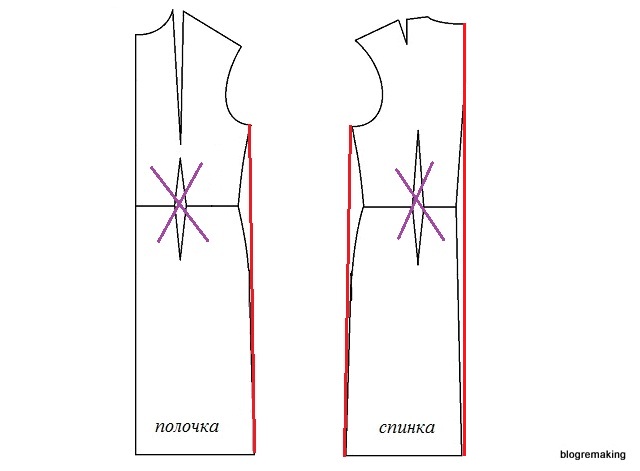 В изделиях объемной формы талевые вытачки, как правило, не используются (в зависимости от модели изделия). Поэтому мы можем просто убрать вытачки по линии талии на полочке и спинке. В зависимости от модели и фасона изделия раствор талевых вытачек по боковым срезам обеих деталей уменьшается частично, либо полностью, в соответствии с этим строятся новые боковые срезы. Если на линии середины спинки есть выемка по линии талии, то эту вытачку также можно убрать и начертить новый серединный срез спинки.