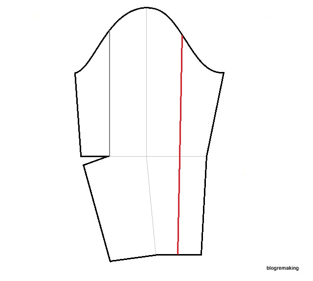 с разрезной спинкой по линии середины возможна еще одна зона, в которую можно размоделировать часть плечевой вытачки — это серединная линия спинки. На этот участок спинки допустимо размоделировать до 0,6см плечевой вытачки.
