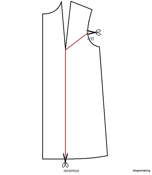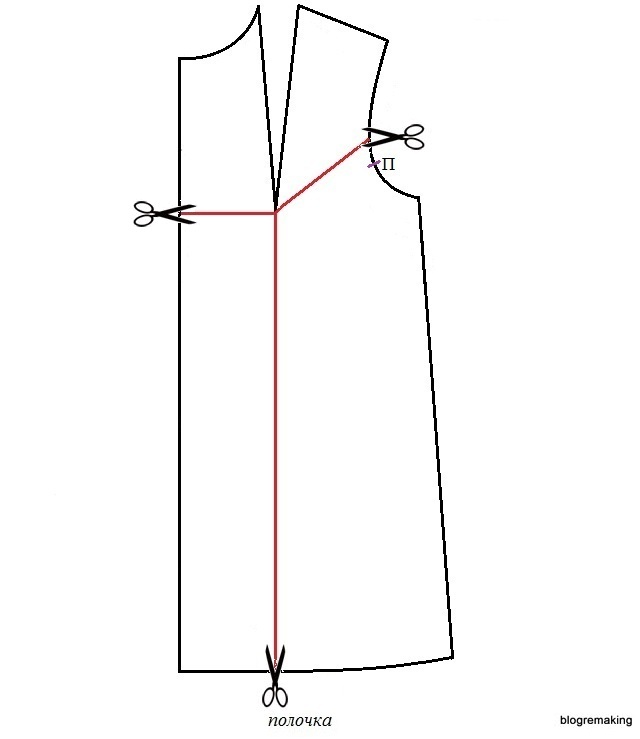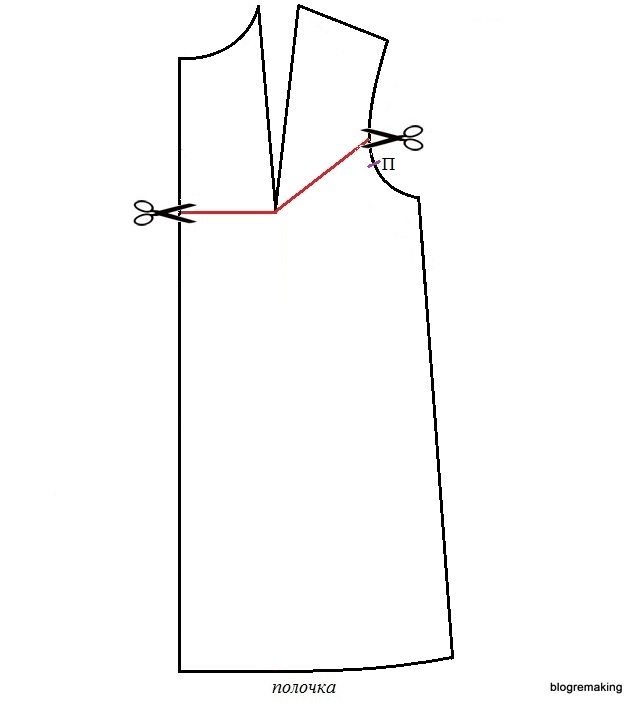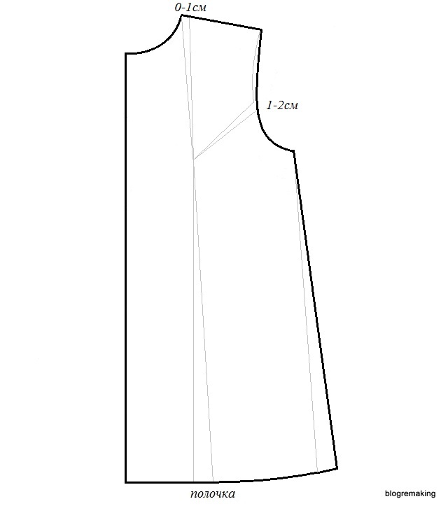 На этот раз верхнюю часть полочки необходимо опустить параллельно линии разреза на величину до 1см. В линию проймы переводим раствор нагрудной вытачки до 2см, оставшуюся часть — в линию низа.
