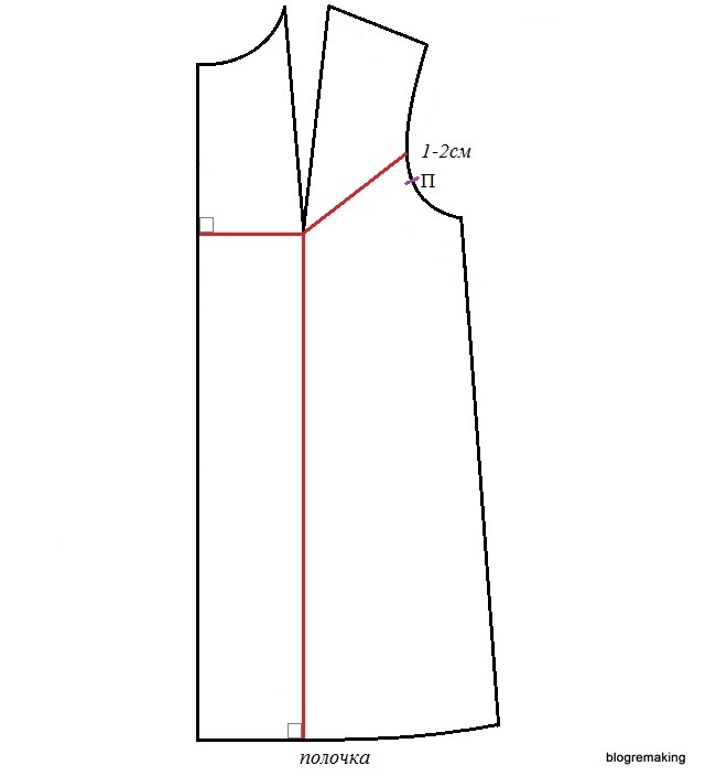 в линию середины — вспомогательная линия строится из вершины нагрудной вытачки к линии середины полочки под прямым углом;
