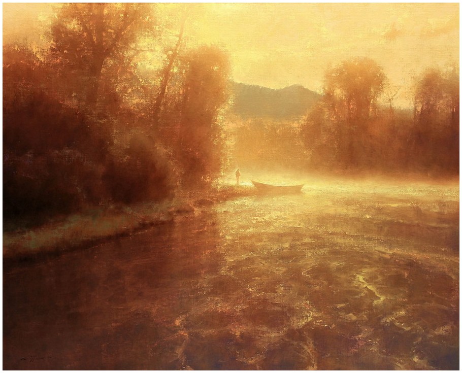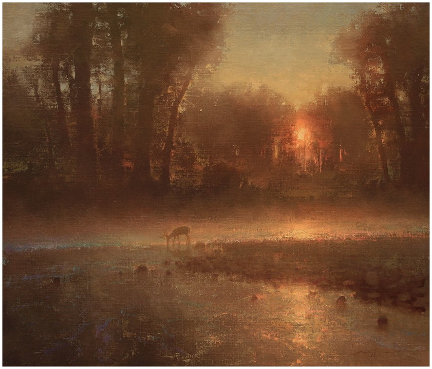Тематика его картин - пейзаж, но при этом, каждая его работа не похожа на другую. Удивительное чувство света и цвета отражается в его полотнах. Сумерки, рассвет, туман - он играет временем и порой года, передавая всю красоту природы. Давая нам возможность замереть, остановиться и насладиться созерцанием красоты окружающих нас рек, озер, лесов и равнин, почувствовать морозность осеннего воздуха или теплоту солнечных лучей восходящего солнца или окунуться в предсумеречную тишину леса. Насладиться всем тем, чего так не хватает нам - жителям города.