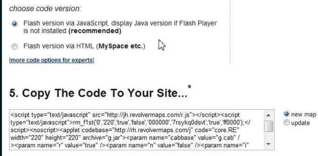 Далее следует выбрать вариант кода для вставки: Флэш-версию с помощью JavaScript, если Flash Player не установлен (рекомендуется), или Флэш-версия с помощью HTML. Далее, копируете полученный код и вставляете на свой сайт.