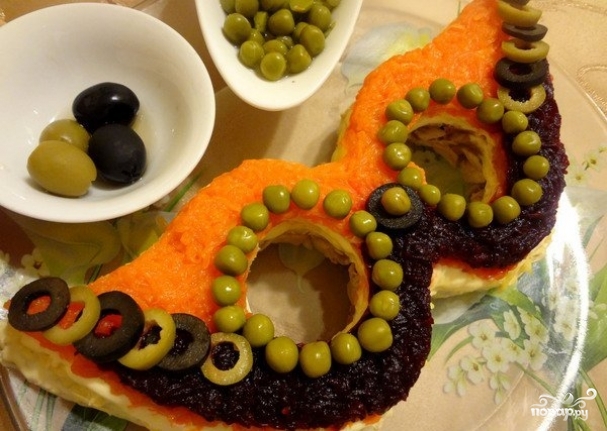 Салат “Новогодняя маска” очень украсит праздничный стол! Как всегда, все гениальное просто! Любой любимый салат выкладывайте в виде маски и украшайте по своему вкусу, в прямом и переносном смысле.
