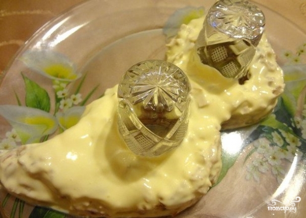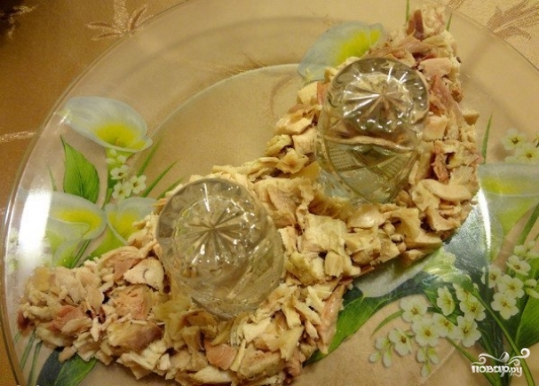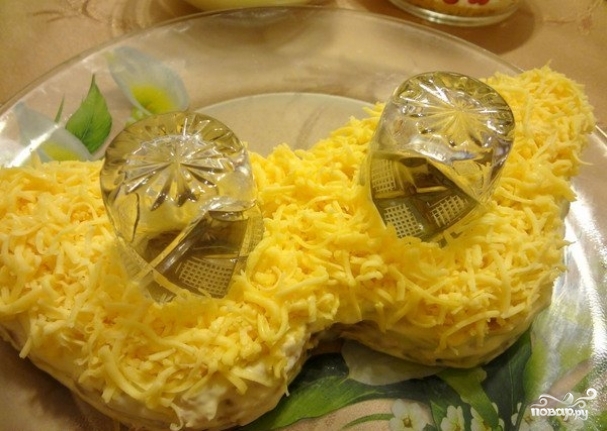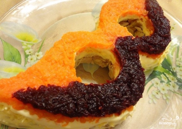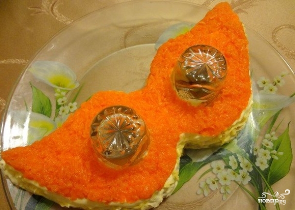 Возьмите овальное блюдо и с помощью двух стаканов выложите салат слоями в форме маски.