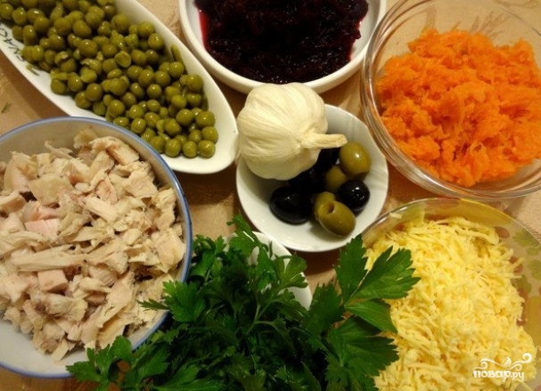Салат “Новогодняя маска” готовится с отварными овощами, лучше их подготовить заранее, чтоб они остыли. Сыр берите твердый, хорошего качества. Вместо отварной курицы можно взять любое другое мясо. Блюдо с маской украсьте зеленью. Салат “Новогодняя маска” можно сделать и из традиционной для Нового Года селедки под шубой. Советую свеклу после того, как вы ее натрете хорошенько отжать или выложить на салат в последний момент, чтоб не было слияния красок. Успехов и приятного аппетита!