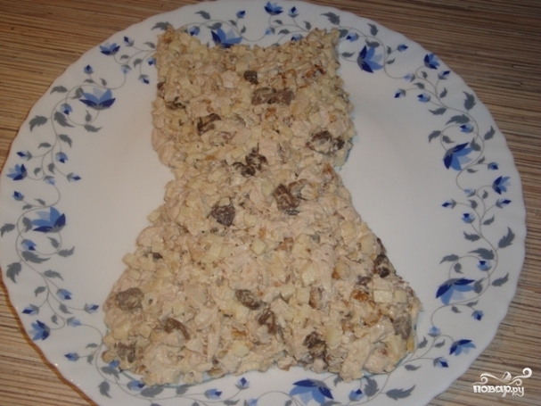 Куриное филе нарежьте на маленькие кусочки. Яблоко почистите и натрите на крупной тёрке, грецкие орехи измельчите. Куриное филе, шампиньоны, яблоко и грецкие орехи выложите в чашку, добавьте майонеза, посолите и всё хорошо перемешайте. Выложите салат по контуру.