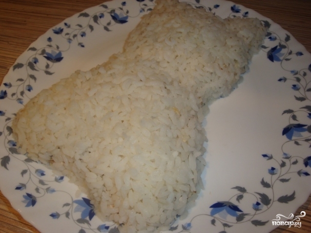 Теперь выложите варёный рис поверх "кота". Облепите со всех сторон.