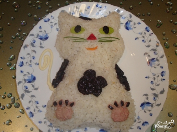 Салат "Кот" очень сытный и вкусный. Может заменить целый обед. Я помню, как моя малышка отказывалась кушать, хотела только сладкое. А такое замечательный котик пробудил в ней аппетит. Салат в виде кота - это замечательная идея! Не забудьте перед приготовлением салата отварить рис и куриную грудку. Описываю вам пошаговый рецепт салата "Кот", чтобы наглядно показать, как сформировать и украсить котика.