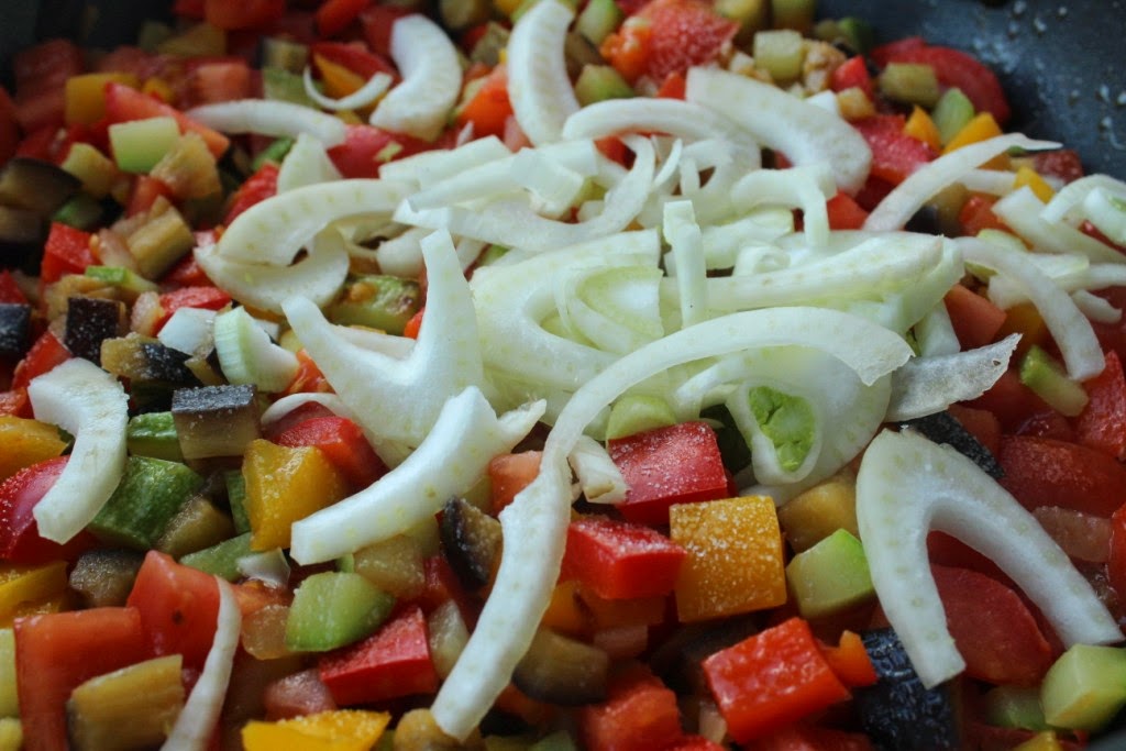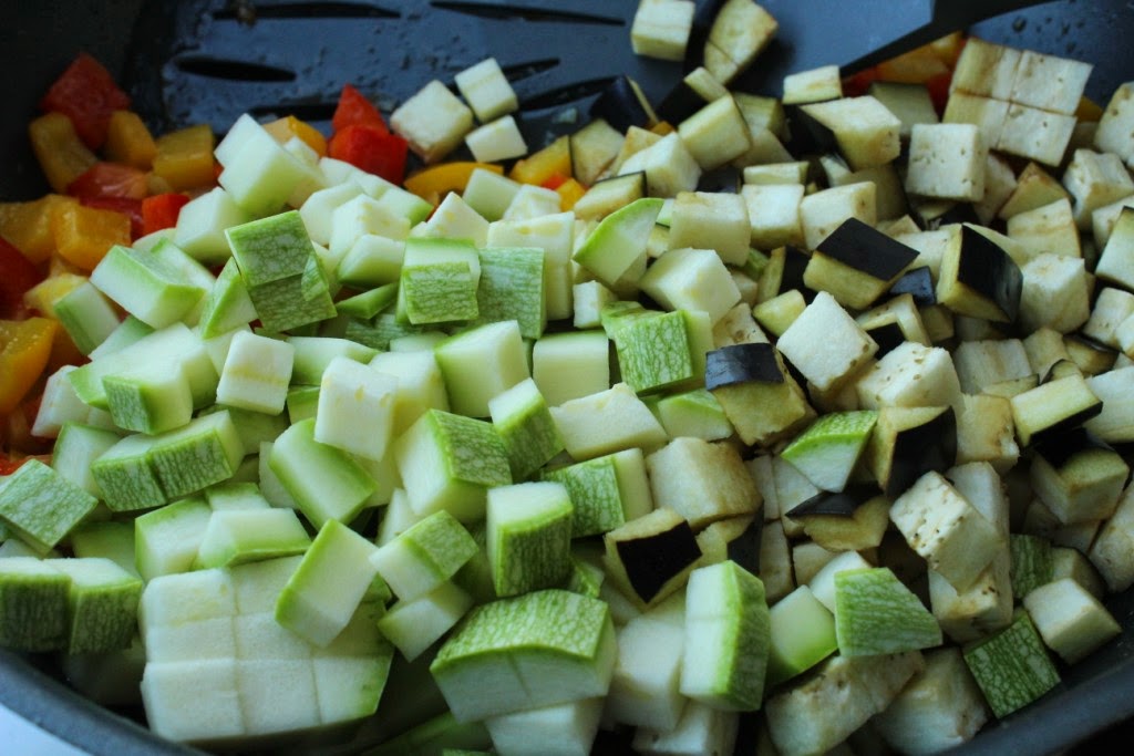 Добавить нарезанные кабачки и баклажаны. Все овощи режем небольшим кубиком со стороной примерно 0,5 см. Обжаривать все вместе 5 минут, непрерывно помешивая.