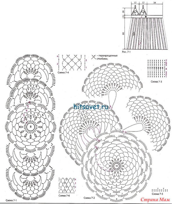 Верхний край подола обвяжите и снизу вверх (от подола к лифу) вывяжите переходную часть узором по схеме 7-3.