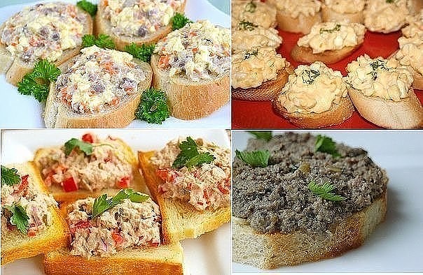 Творог посолить,растереть со сметаной или пробить блендером. Добавить порезанный мелким кубиками болгарский перец, измельченную зелень,черный перец и по желанию, выдавленный через пресс маленький зубчик чеснока. Перемешать. Тонко нарезанные кусочки хлеба или батона намазать получившейся массой. Приятного аппетита! Сверху можно добавить кружок свежего огурца и редиса. Салат-намазка из тунца. 1 банка (170г) консервированного тунца 2 яйца 2 маринованных огурчика 0,5 чашки тёртого сыра Майонез Пошаговый рецепт Сварить яйца вкрутую, очистить, мелко порубить. Открыть банку с тунцом, слить воду и размять тунец вилкой. Мелко нарезать маринованные огурцы. Сыр натереть. Всё смешать и заправить майонезом.
