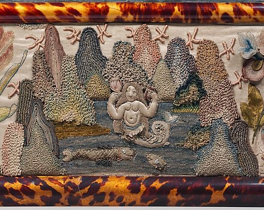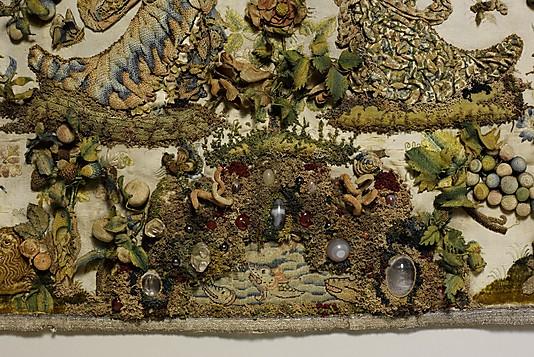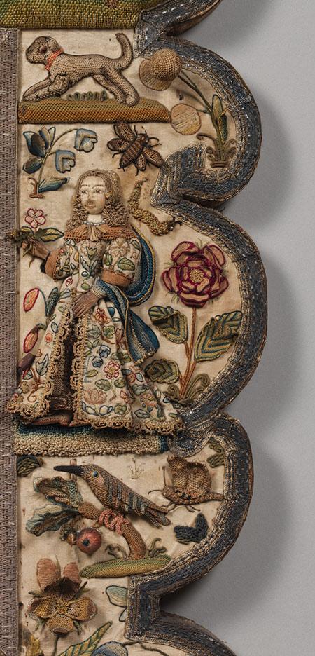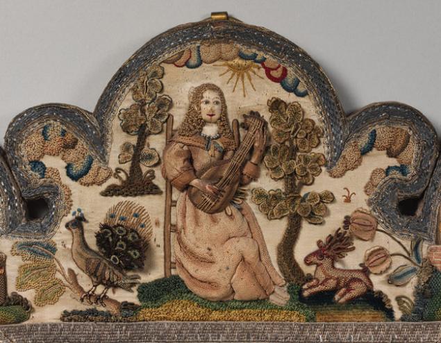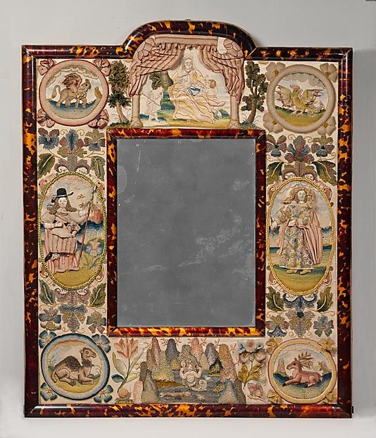 В середине XVII века в моду вошла объемная вышивка, которая чаще всего встречается на рамах зеркал. На них изображали мужчин и женщин в роскошных одеждах, которые приветствуют друг друга.