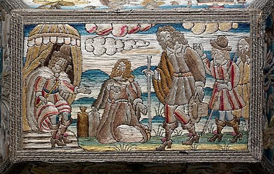 1665 г. Объемная вышивка. Житие Святой Эсфири. Самый популярный сюжет в английской вышивке XVII века. Эсфирь считали образцом багочестия и смелости, а также красоты.