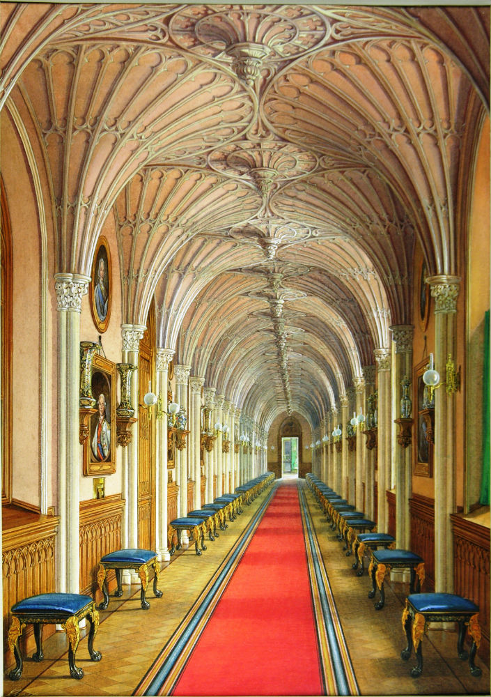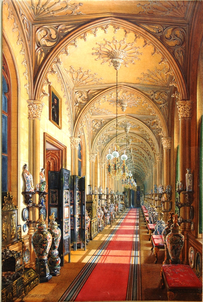 Вдоль личных комнат Николая I и Александры Федоровны протянулась Готическая галерея — замечательный образец неоготического стиля. В окна галереи были вставлены цветные стекла, создававшие иллюзию средневековых витражей. Другая галерея, также оформленная в неоготическом стиле, находилась на третьем этаже Арсенального каре. Она называлась Китайской, так как в ней экспонировалась уникальная по художественному уровню коллекция произведений китайских и японских мастеров, включавшая около 4000 экспонатов (ил. 17, 18).