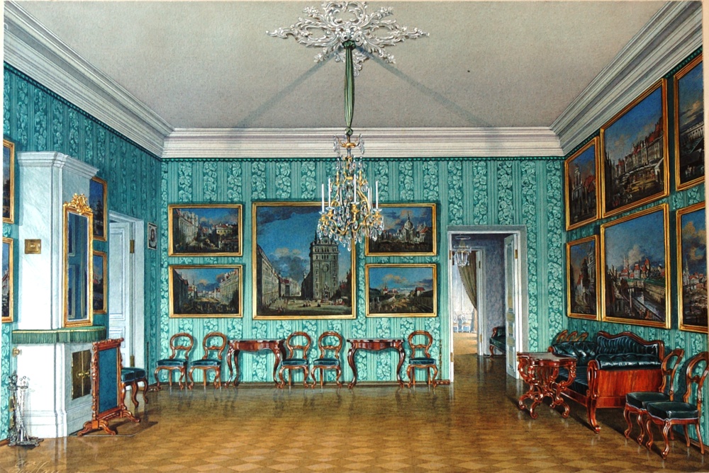 Одиннадцать из созданных Гау акварелей запечатлели гостевые комнаты третьего этажа Центрального корпуса (ил. 25, 27, 28). Эти комнаты были созданы в начале 1850-х годов по проекту Р.И. Кузьмина, но отделаны в 1860-е и 1870-е годы. В состав этих помещений входило несколько спален, гостиных и кабинетов. В интерьерах находилась мягкая мебель в стиле второго рококо, сделанная в мастерской А. Тура. На стенах можно было увидеть много живописных полотен. Ряд комнат украшали городские пейзажи известных венецианских художников-ведутистов Б.П. Белотто и Д.А. Каналетто. В других помещениях находились крупноформатные картины на исторические сюжеты и портреты. В Желтом зале по стенам были развешены портреты героев войны 1812 года, созданные художником Д. Доу (ил. 26). Это повторения его работ, выполненных для галереи 1812 года в Зимнем дворце.